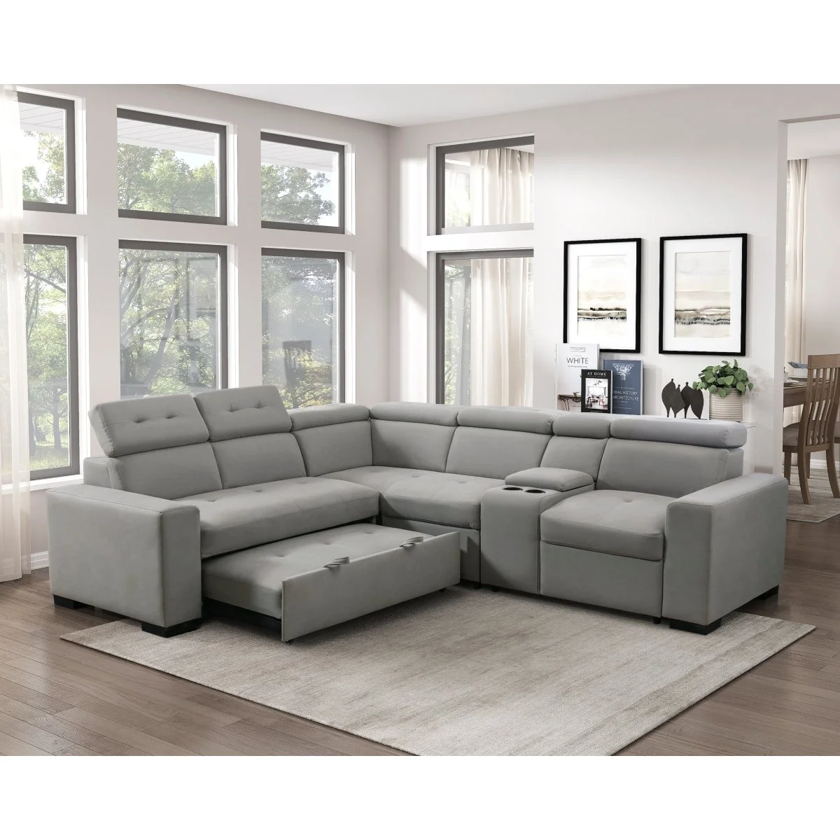 Providing ample space for relaxing, the Farrah Collection transforms from seating to sleeping platform with convenient ease. The left facing two-seat unit features a pull-out bed, its platform rising to meet the seat. The corner seating unit extends to meet the end chair, its functional console providing access to your beverages by way of the two cupholders while a lift top opens to reveal hidden storage. With ease of motion, the collection’s headrests adjust via click motion mechanisms. Furthering the modern look, gray polished microfiber fabric upholstery covers the collection.